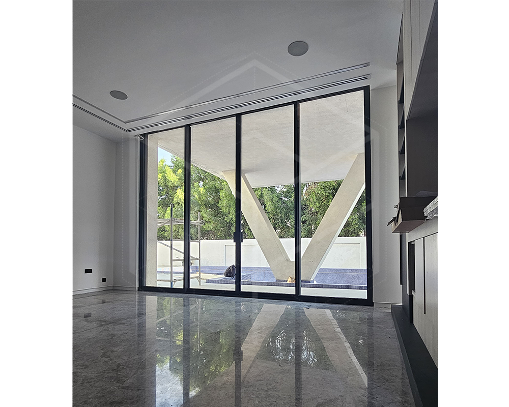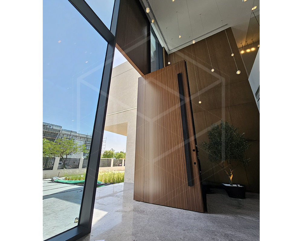 A prestigious private villa project. The awarded scope included glass and aluminum works, fixed pergola, gates, cladding, pivot door, decorative louvers, glass handrails and shower glass.