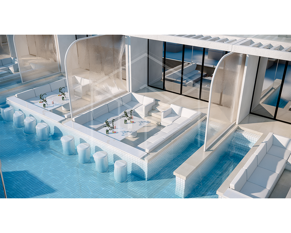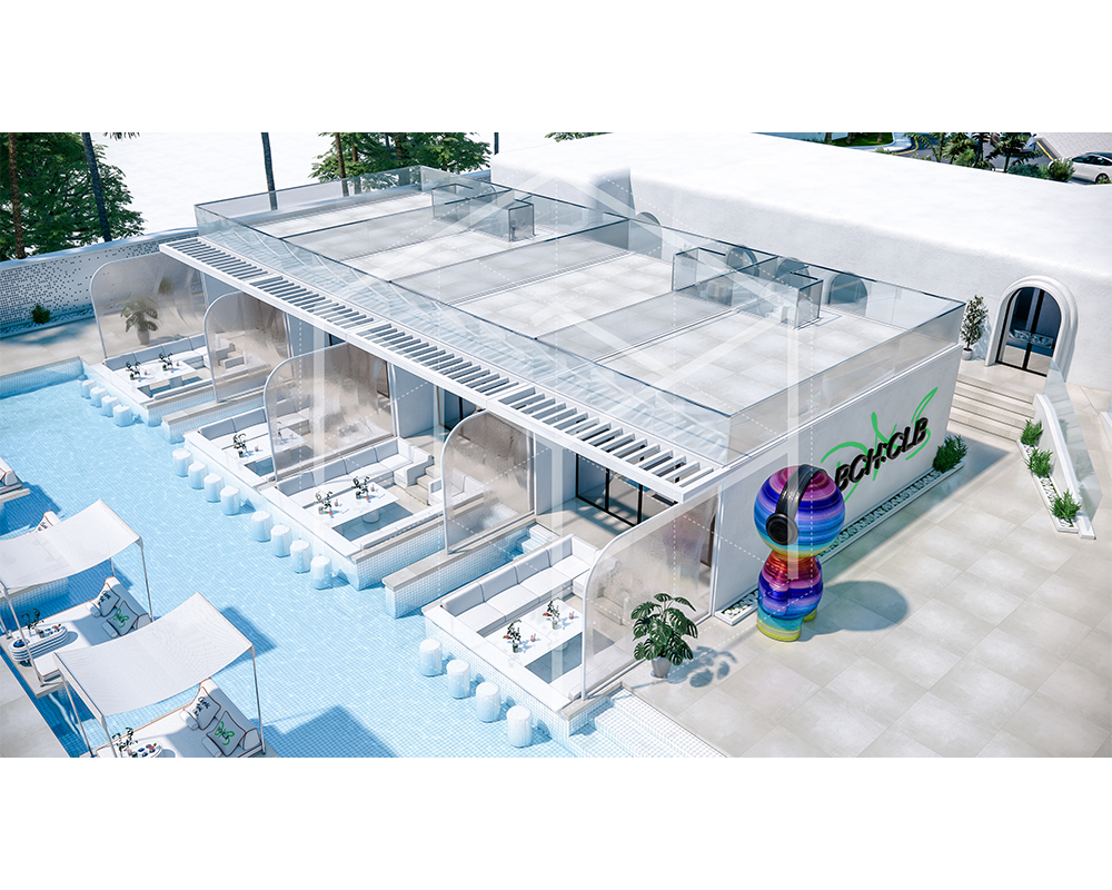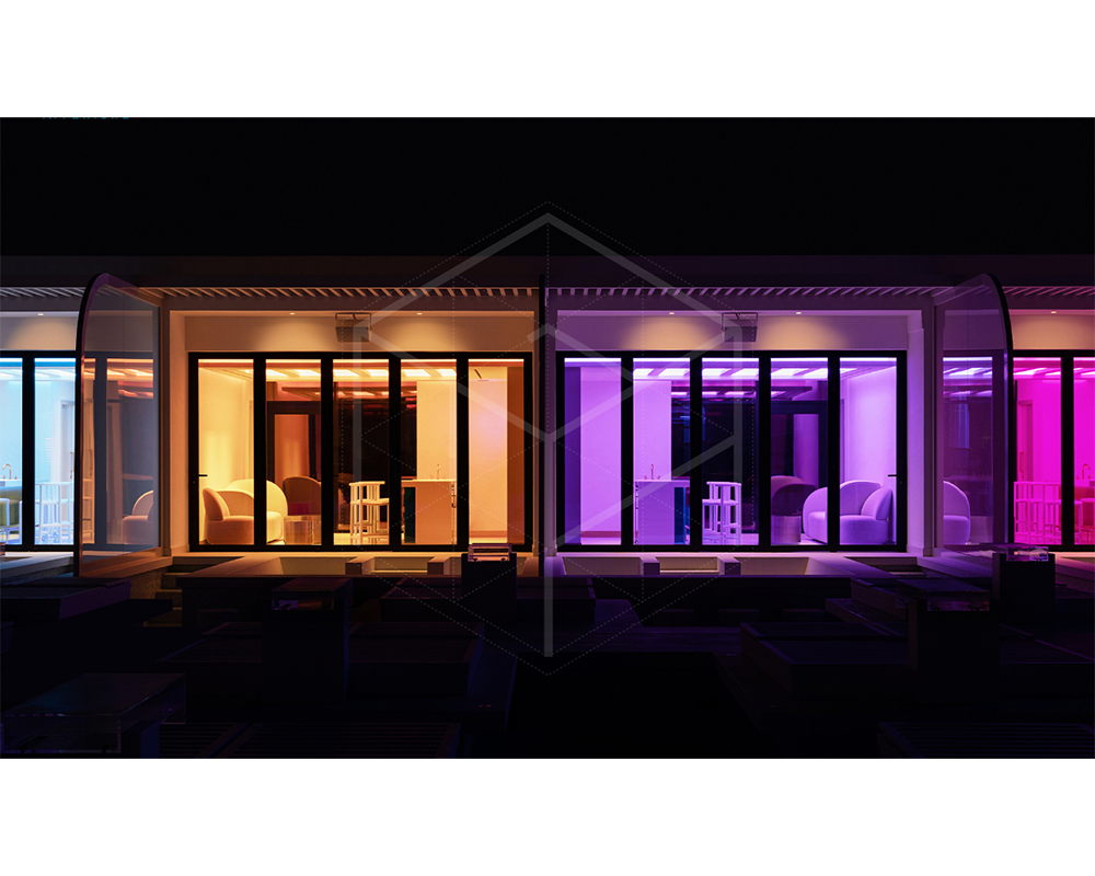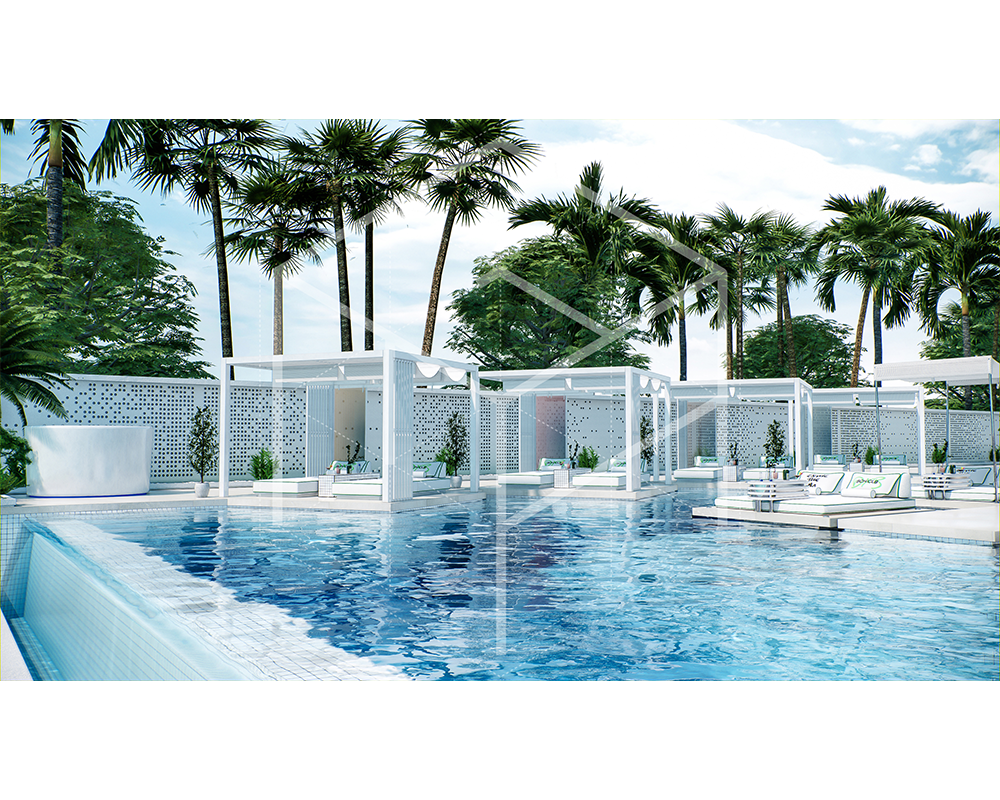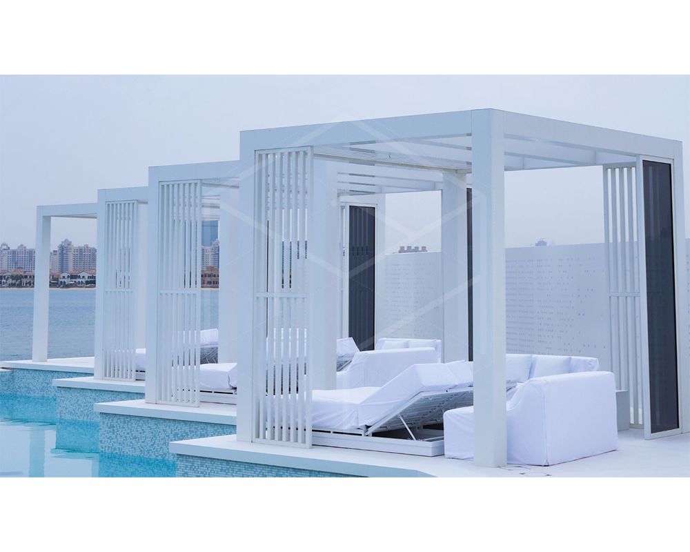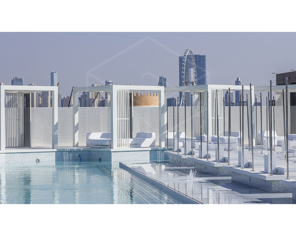 A prestigious beach club. The awarded scope included glass and aluminum works, pergola ACP, balustrades, steel structure, automatic door, sound proof wall, decorative walls, louvers and folding doors.
