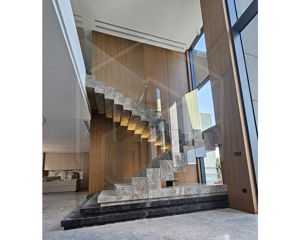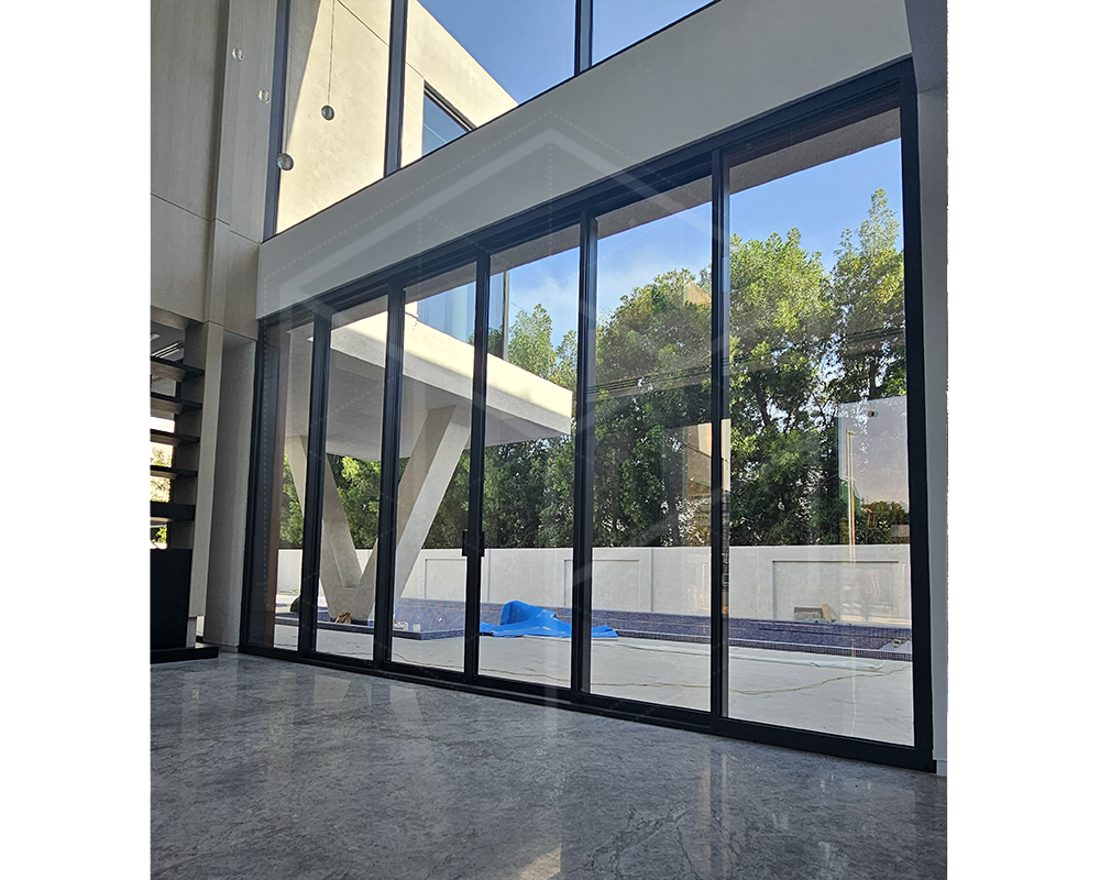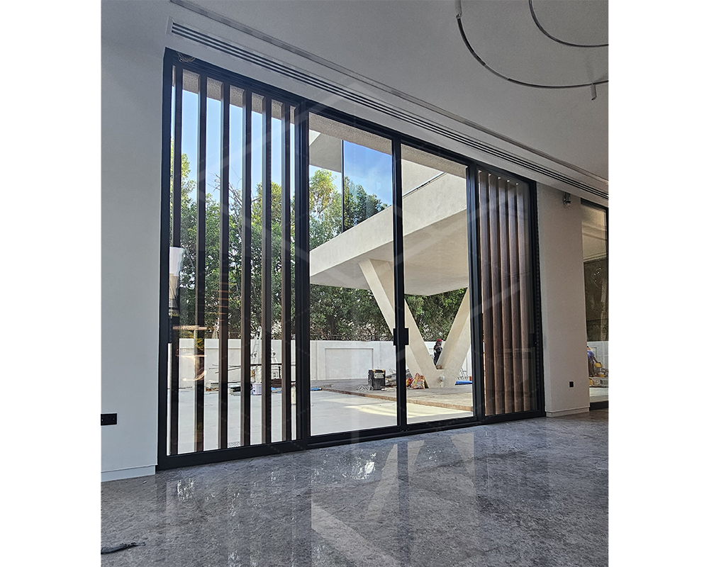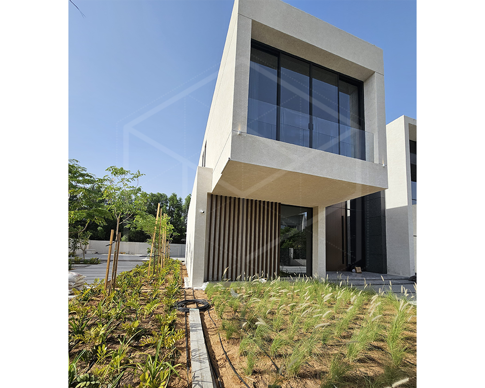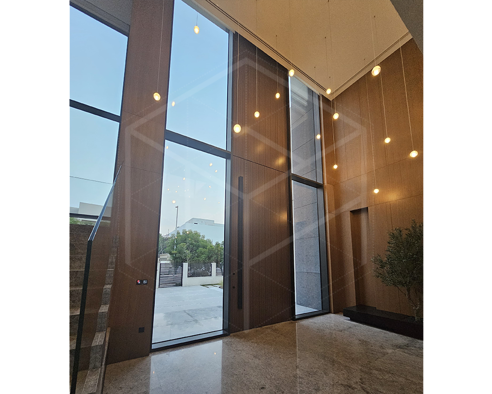 A prestigious private villa project. The awarded scope included glass and aluminum works, fixed pergola, gates, cladding, pivot door, decorative louvers, glass handrails and shower glass.